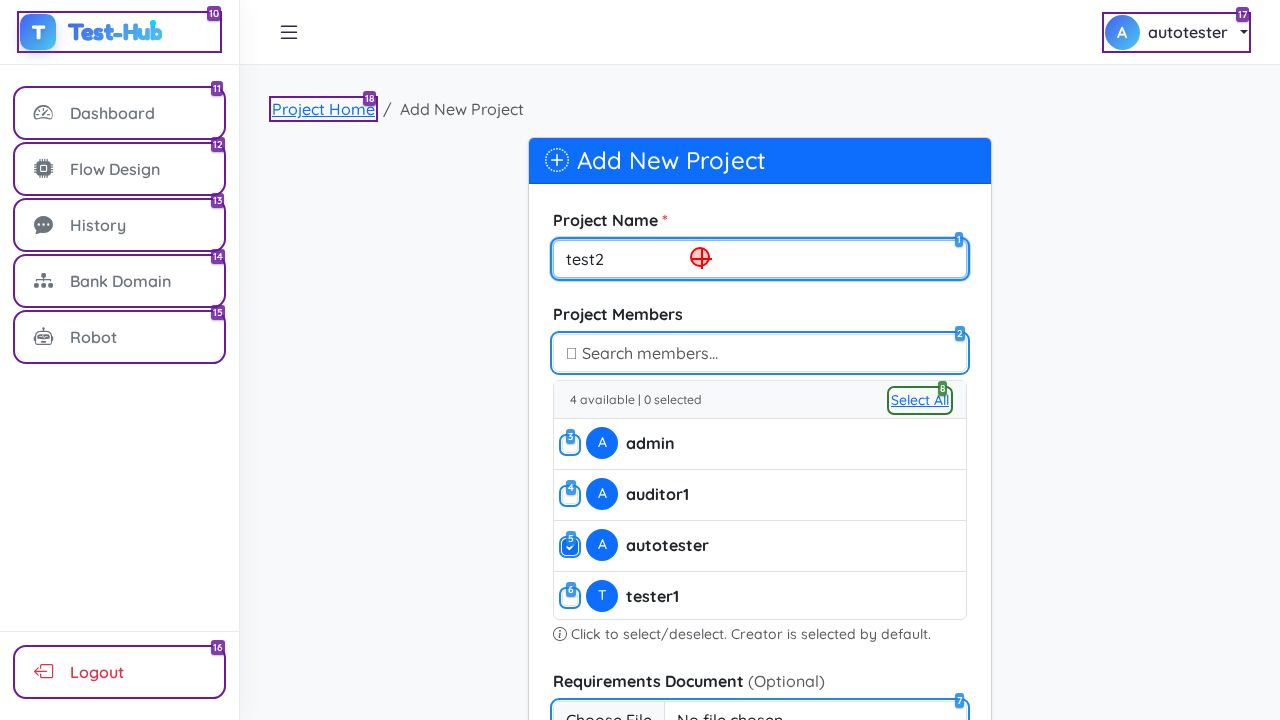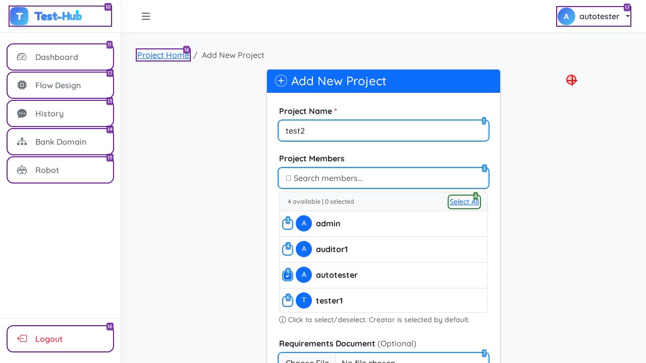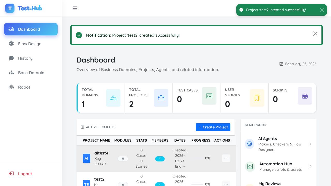 ✅ PASSED: All expected actions executed successfully and the page state updated with a success notification showing 'Project 'test2' created successfully!' and the new project appears in the project list.