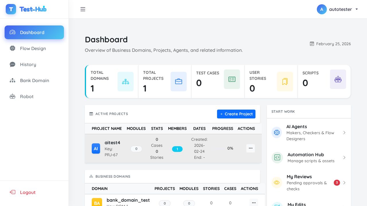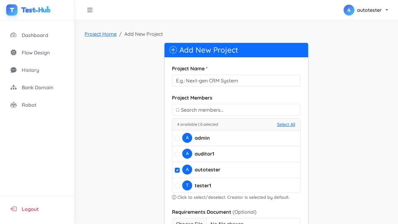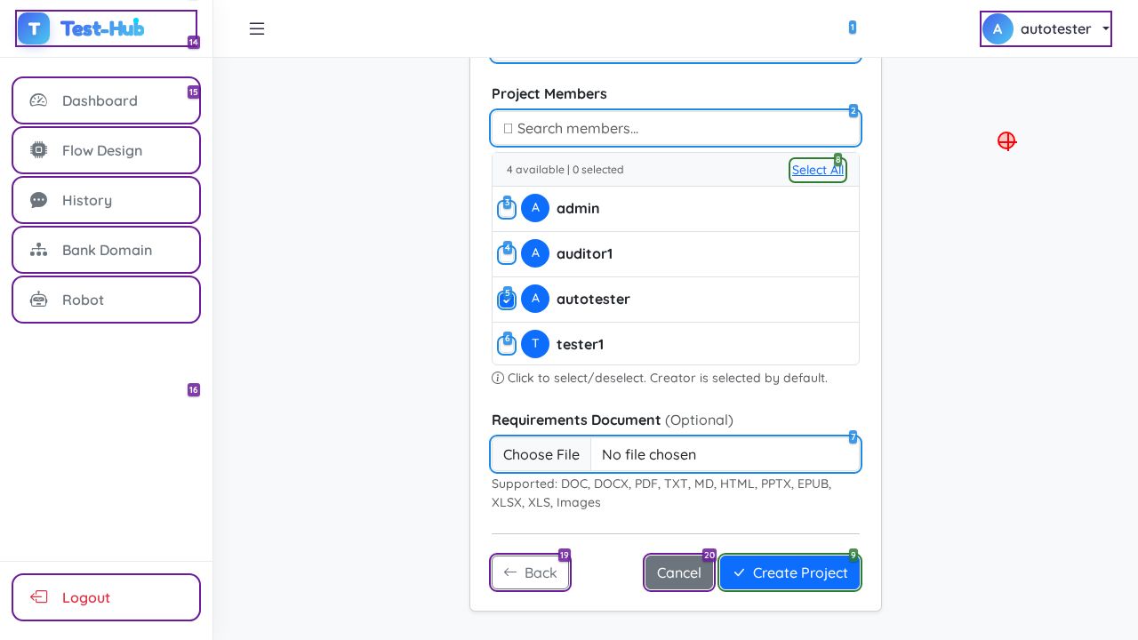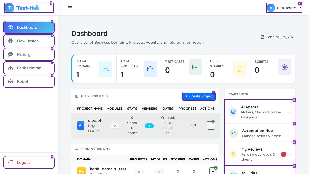 ✅ PASSED: All expected actions executed successfully and the page state updated with a success notification showing 'Project 'test2' created successfully!' and the new project appears in the project list.