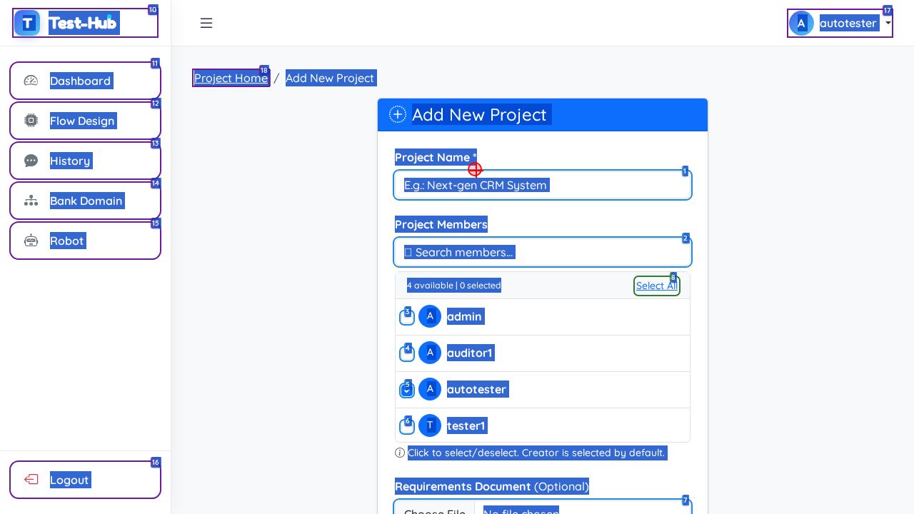 ❌ FAILED: The text input for Project Name field did not update to 'test2' as expected; the field still displays the placeholder text 'E.g.: Next-gen CRM System', indicating the typing action failed to apply the input.