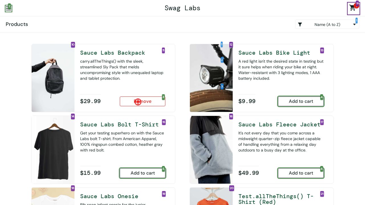 ✅ PASSED: The 'Add to Cart' button was clicked and the button state successfully changed to 'Remove' on the first product card, indicating the action completed successfully.