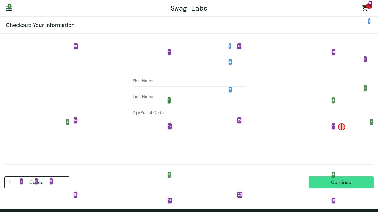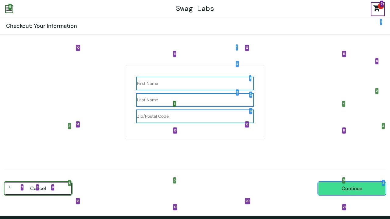 📍 Step 6/7: 在结账信息页依次填写 First Name 输入框为 ,Last Name 输入框为 ,Zip/Postal Code 输入框为 ,然后点击“Continue”