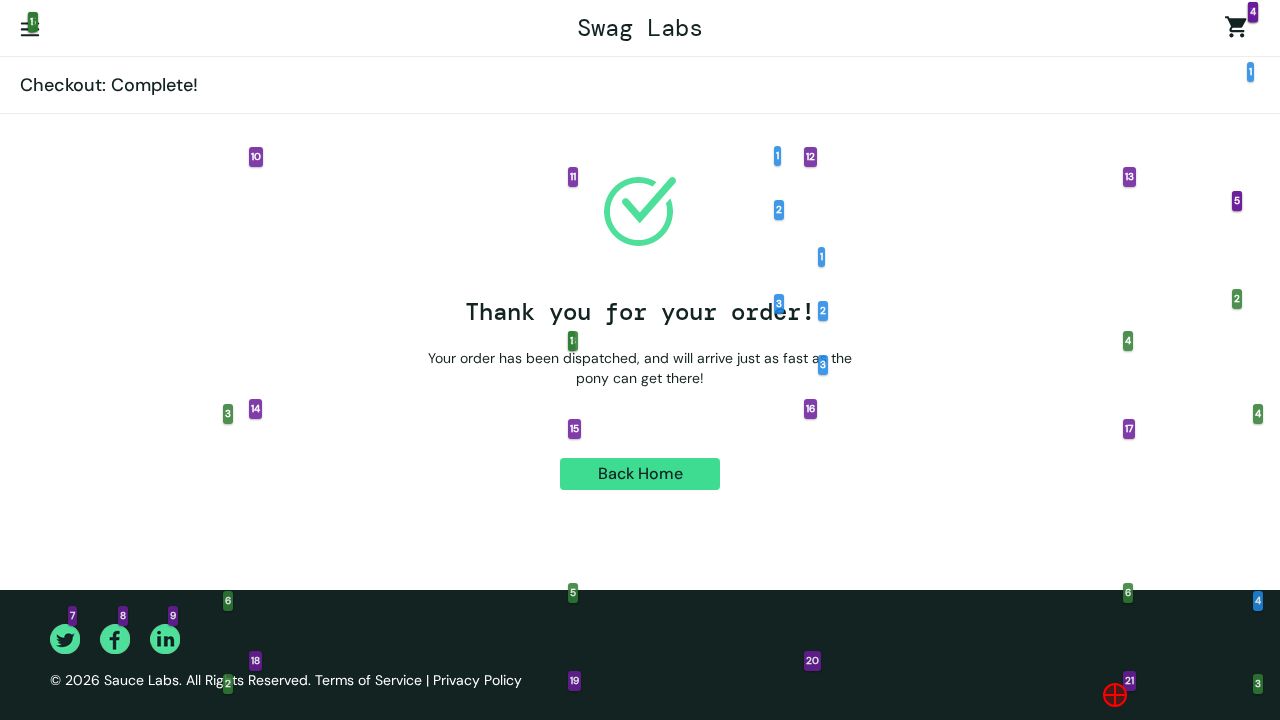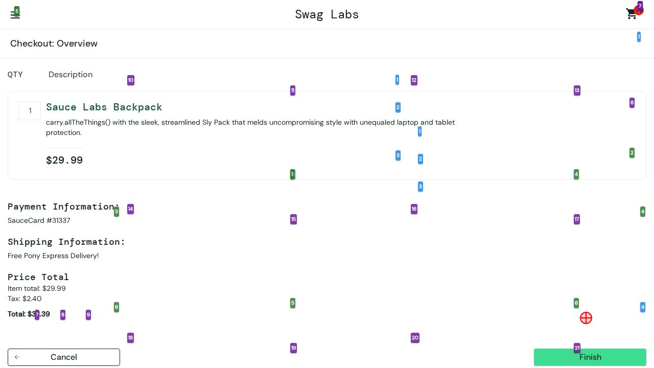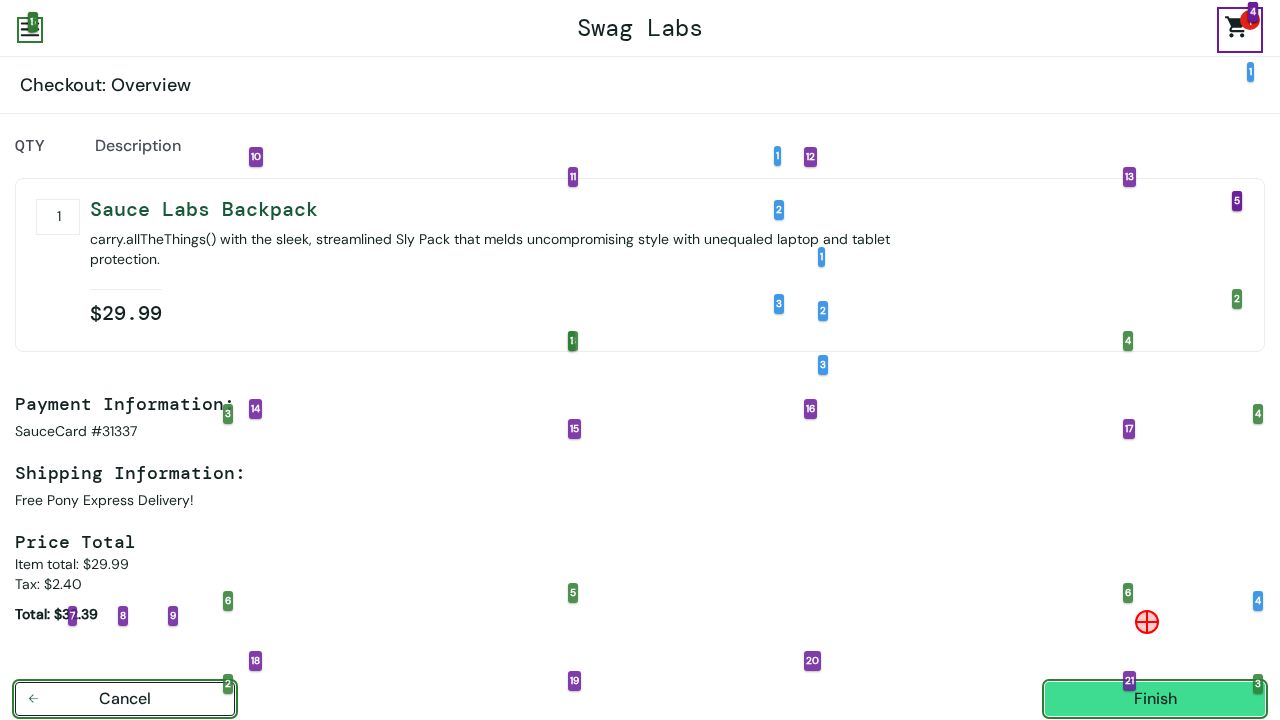 ✅ PASSED: The page has successfully navigated to the checkout complete page after clicking 'Finish' to complete the purchase, showing 'Checkout: Complete!' and order confirmation messages.
